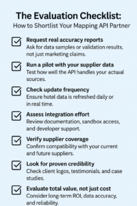 - Before you finalize a hotel mapping API, use an evaluation checklist to compare mapping accuracy, integration effort, and vendor credibility.